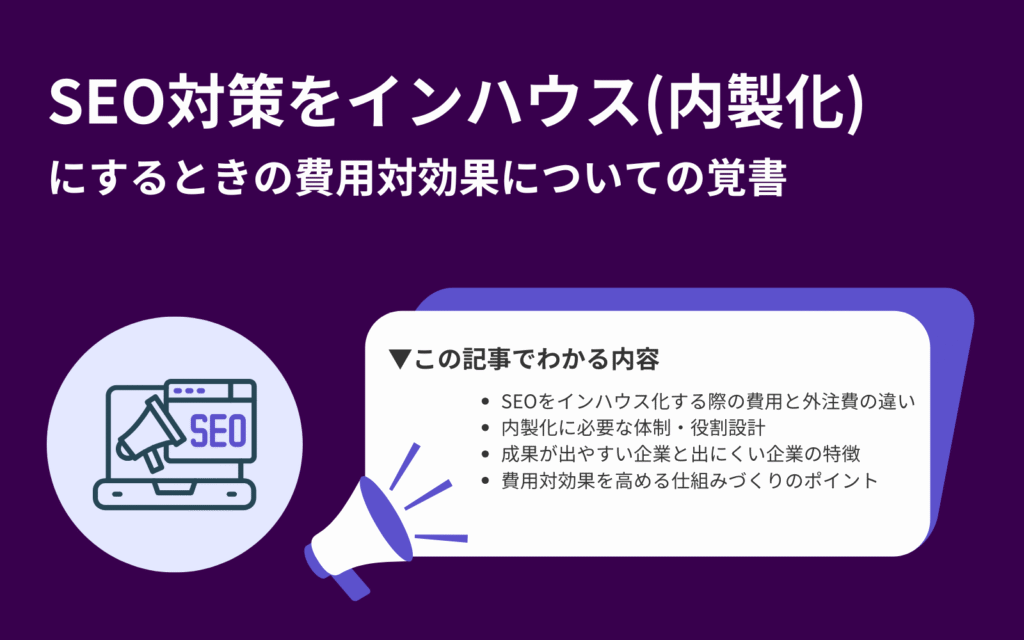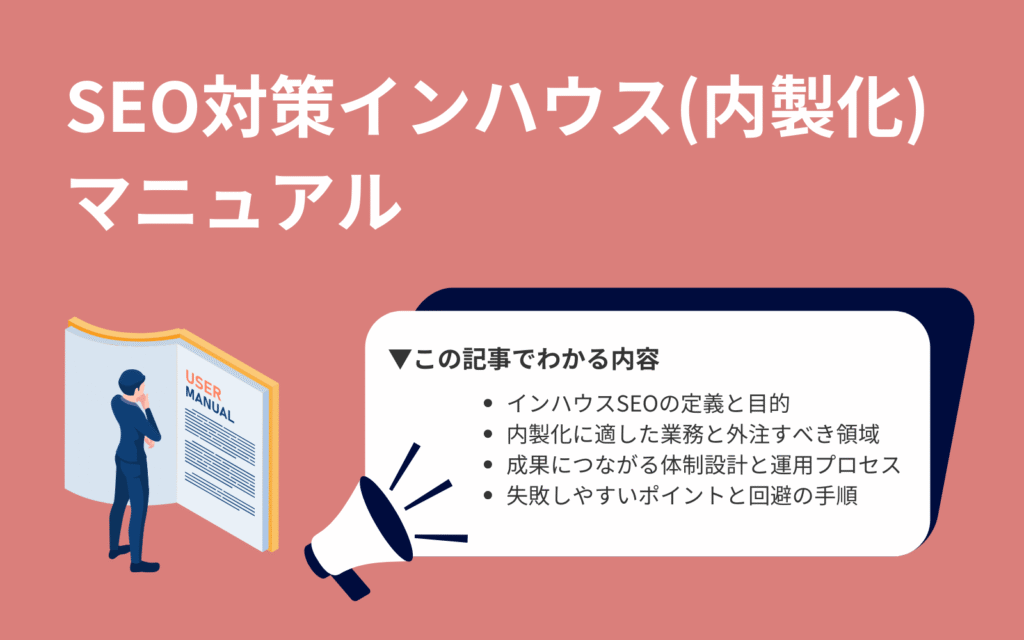SEO対策は外注に任せることで短期的な立ち上がりは早くなりますが、施策の再現性が社内に残りにくいという課題があります。 一方、分析・キーワード設計・改善のPDCAといったプロセスを社内に蓄積する“インハウス化”は、担当者が継続的に改善を行える体制... -