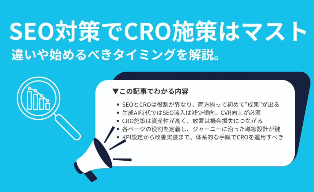 SEO対策だけで集客しても、肝心のコンバージョン(CV)に繋がらなければ意味がありません。 そんな中、成果を最大化するために「CRO(コンバージョン率最適化)」という考え方が注目されています。 CRO施策とは、問い合わせや資料請求などのCVを“増やす”た... -