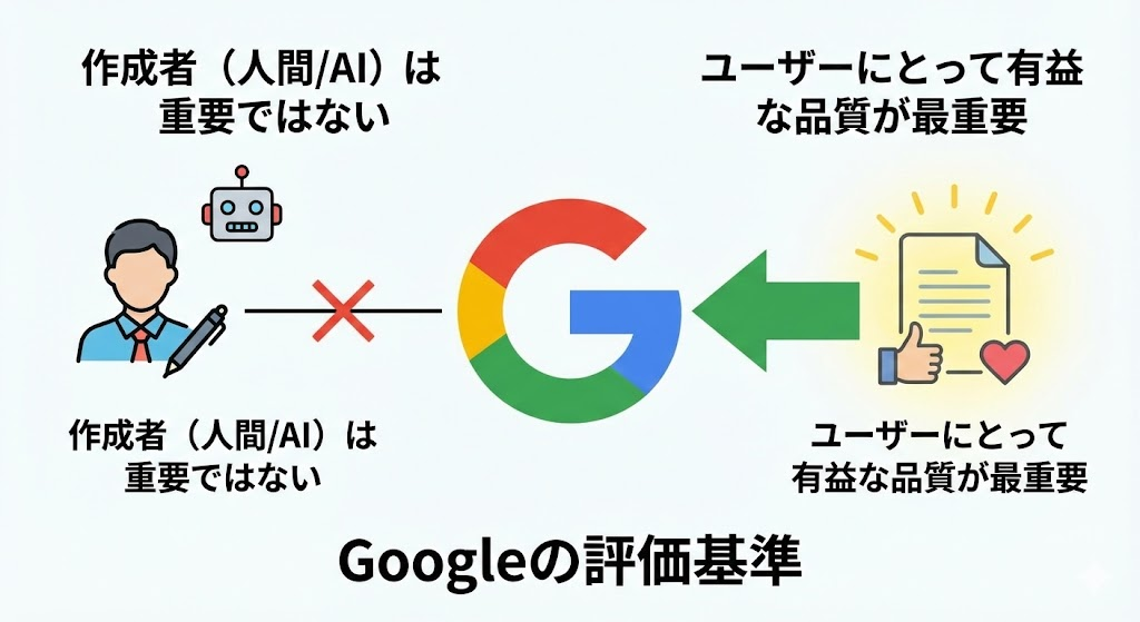 「AIで記事を書くとペナルティを受ける」という噂は誤解です。 Googleは「誰が書いたか(人間かAIか)」ではなく、「ユーザーにとって有益な品質か」を評価基準にしているからです。 公式にもAI利用自体は禁止されておらず、適切に活用すれば十分に上位表示を狙えます。