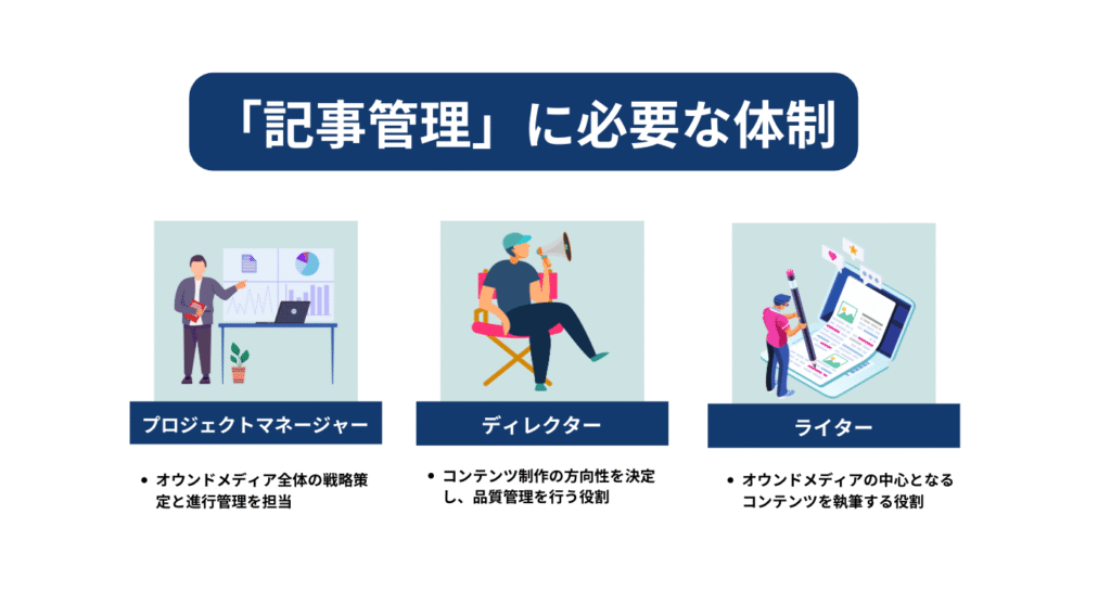 オウンドメディア運営において重要となる3つの職種、プロジェクトマネージャー、ディレクター、ライターの役割と必要性を明確化し、各ポジションがどのように連携することで、メディア全体が成長軌道に乗るのかを解説します。