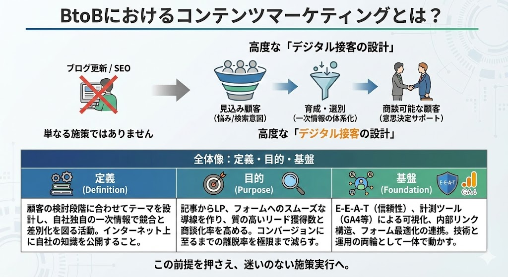 BtoBコンテンツマーケティングの本質は、単なるブログ更新やSEO(検索エンジン最適化)対策ではありません。顧客が抱える悩みや検索意図に沿って、自社の持つ貴重な一次情報を体系化し、Web上で「見込み顧客」から「商談可能な顧客」へと育成・選別していく、高度な「デジタル接客の設計」そのものです。