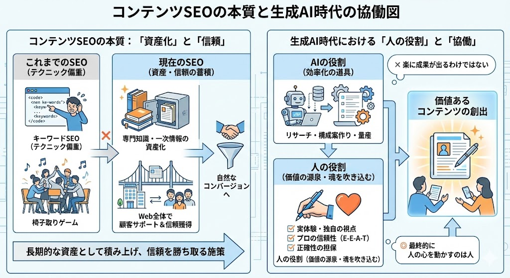 コンテンツSEO成功の要点は、小手先のテクニックではなく、「検索意図への一致」「情報の資産化」「信頼性の担保」、そして徹底した「接客設計」にあります。
