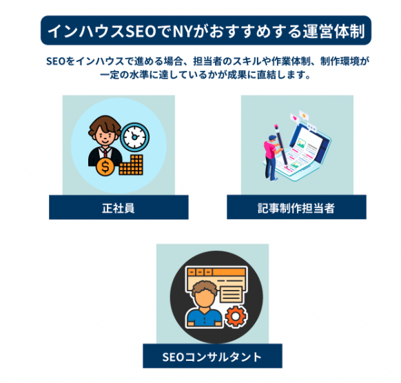NYマーケティングには、まさにそのようなSEOに深い関心を持つ専門家が多数在籍しています。インハウスSEOや運用に課題を感じている場合は、一度ご相談いただくことをおすすめします。