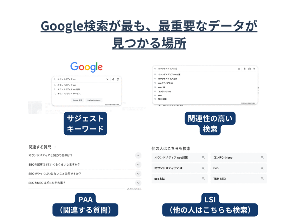 実際に多く検索されている組み合わせや関連語をGoogleが提示しているもので、ユーザーの興味関心を直接反映しています。