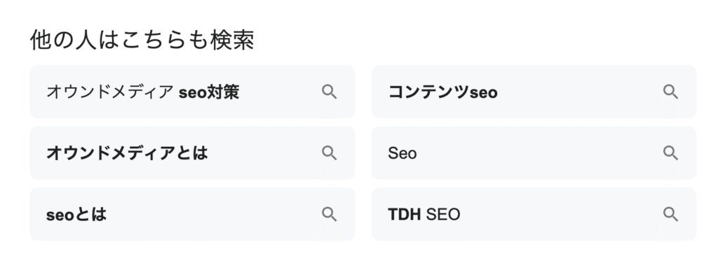特に注目すべきは、検索結果に表示される補助的な情報です。ユーザーが次に求める可能性の高いキーワードや関連情報が提示されているため、「ユーザーニーズを先回りしてコンテンツを設計する」ことができます。