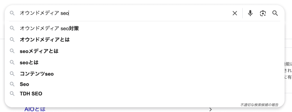 例えば「SEO ツール」と入力すると、「無料 SEO ツール」「SEO チェック」「SEO 会社」などの候補が出てきます。