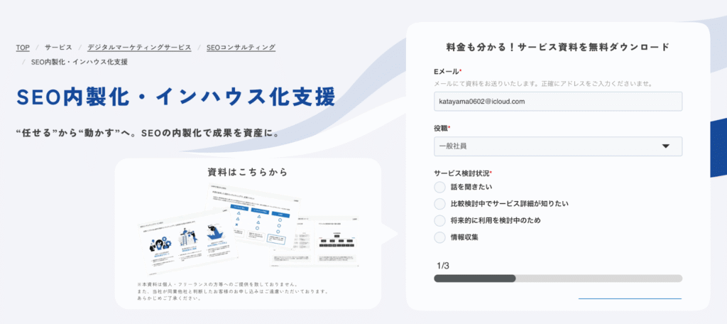 | サービス内容 | SEO内製化支援およびインハウスSEOコンサルティング:自社内でSEO運用を実現するための戦略設計・担当者育成・体制構築支援。 |