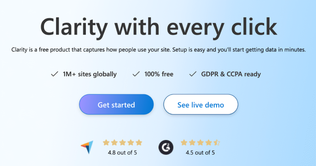 Microsoft Clarity は無料で使えるサイト行動分析ツールで、ユーザーがどの部分をクリックしたか・どこまでスクロールしたかを可視化するヒートマップ機能や、ユーザーのセッション録画機能などを搭載しています。