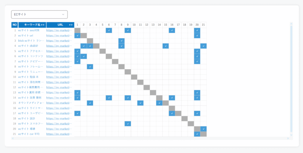例えば、ある記事の内部リンクがほとんど貼られていないことが可視化されれば、その記事をピラー(柱)として設定し、類似テーマの記事から内部リンクを設けてクラスター構造を強化するアクションを取れます。