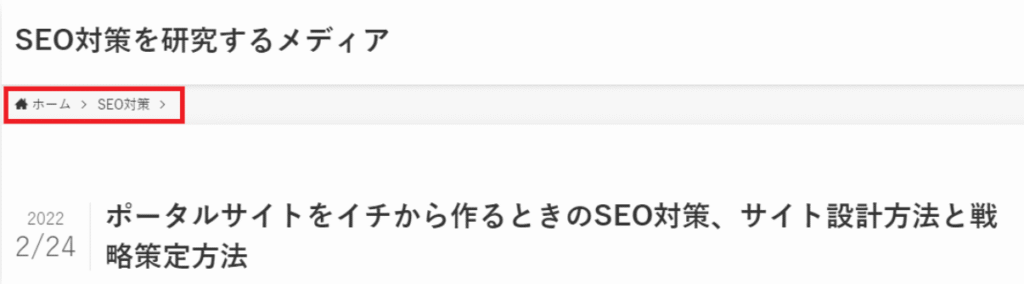 パンくずリストとは、「サイト内のどの位置にいるか」を示す内部リンクです。ページの上部に表示されていることが多いです。