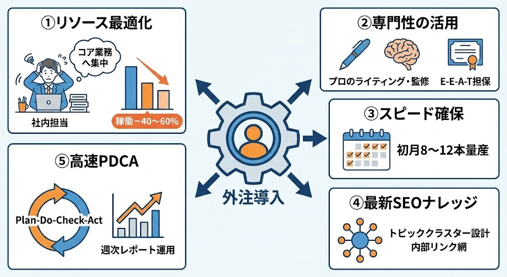定型的な標準工程(執筆、入稿など)を外部に切り出し、社内メンバーは戦略的な意思決定と効果検証にリソースを集中させるべきです。SOPと明確な役割分担があれば、外注化によって社内のボトルネックが解消されます。