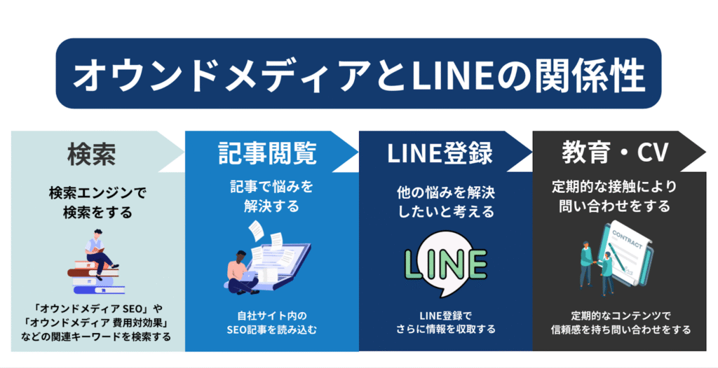 オウンドメディアとLINEの最大のシナジーは、「検索→記事閲覧→LINE登録→教育→CV」という一連の流れを構築できる点にあります。
