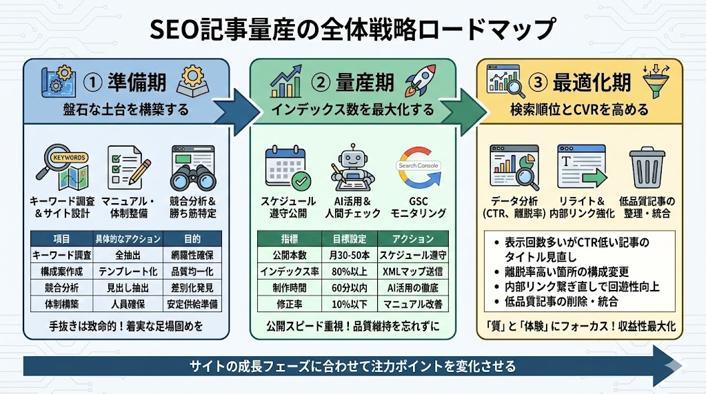 記事の量産を成功させるには、闇雲に書き始めるのではなく、時期ごとに明確な役割を持たせたロードマップが必要です。
