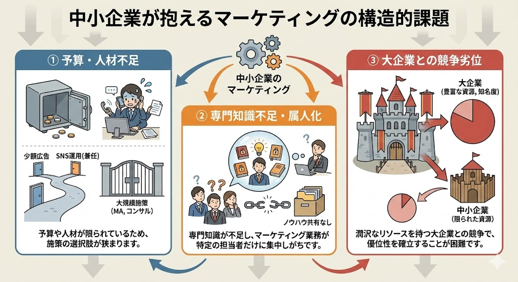 中小企業や個人事業主のマーケティング担当者が抱える構造的な課題は、限られた予算と人材の中で、いかに集客効率を高め、大企業との競争優位性を確立するかという点です。