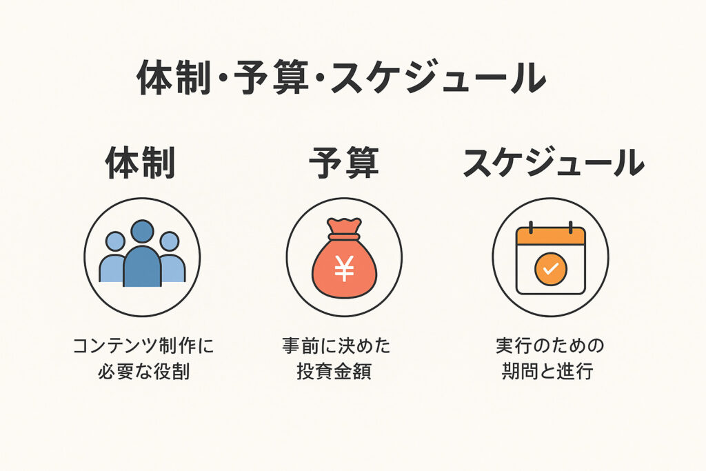 6–12ヶ月はブランド指標→CVの順で立ち上がる前提で予算化。外注×内製のハイブリッドで、専門家の権威と自社一次情報を接続します。体制・予算・スケジュールを最初に合意し、四半期でレビューします。